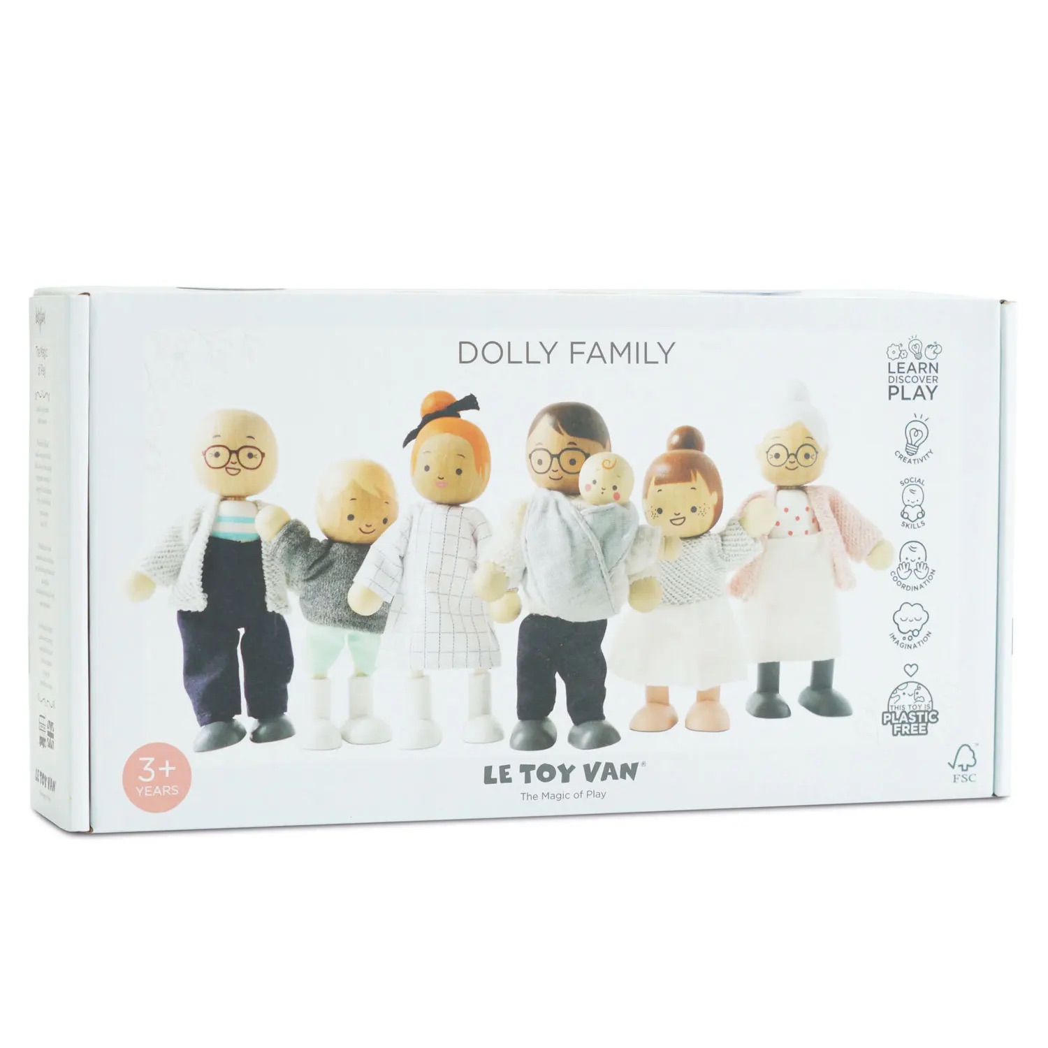 6-köpfige Familie in liebevoll handgefertigten Kleidungsstücken mit biegsamen Gelenken zum fröhlichen Spielen