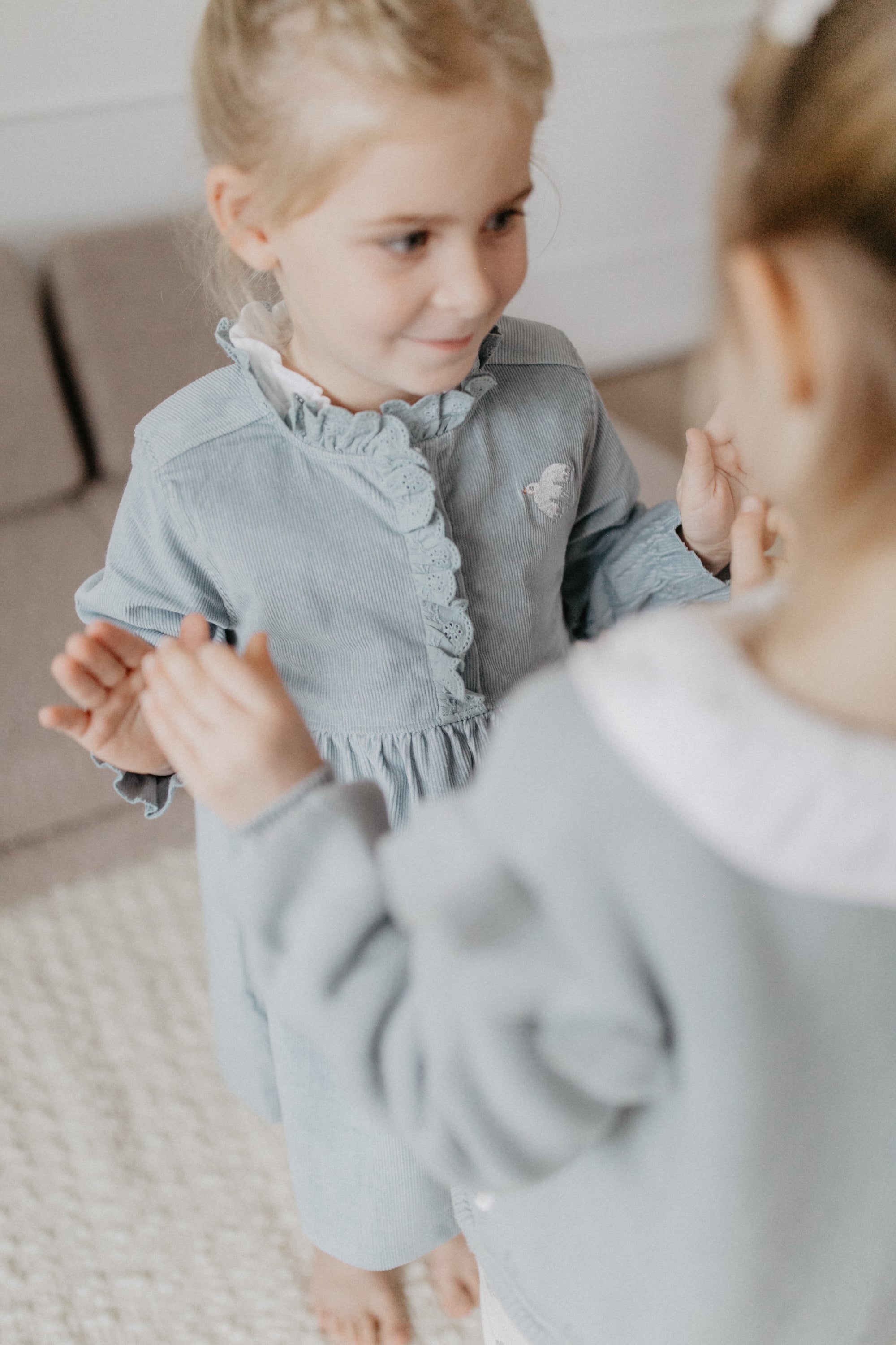 Kleid aus Kord mit kleinen Rüschen und Stickerei ( Taube) vorn
