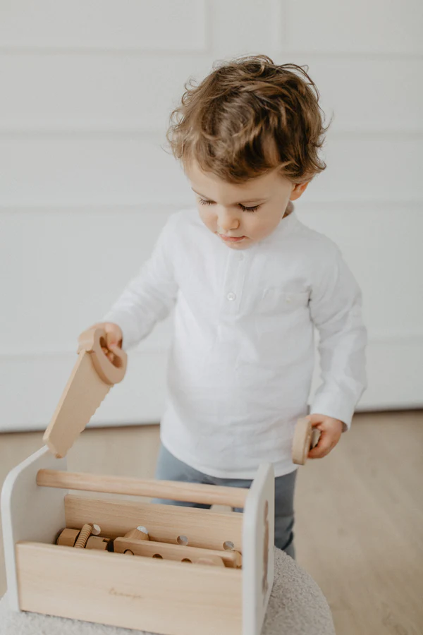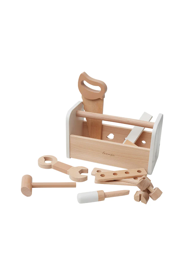 Werkzeugkiste: Hammer, Säge, Schraubendreher, Winkel, Schraubenschlüssel, 4 Schrauben mit Muttern, 3 gelochte Verbindungselemente
