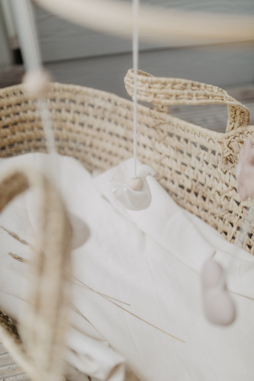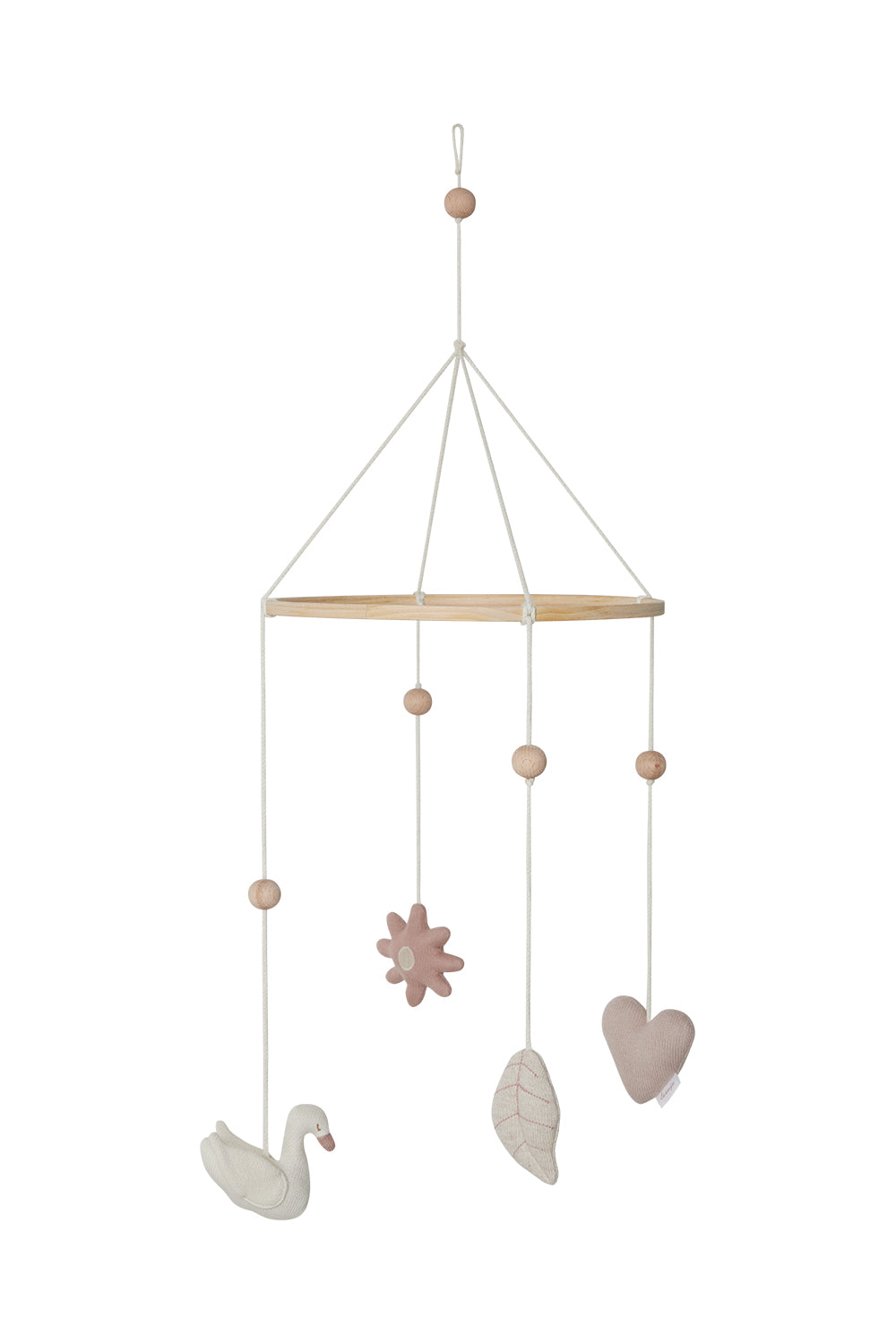 Mobile mit gestrickten Figuren: Schwan, Blatt, Blume, Herz