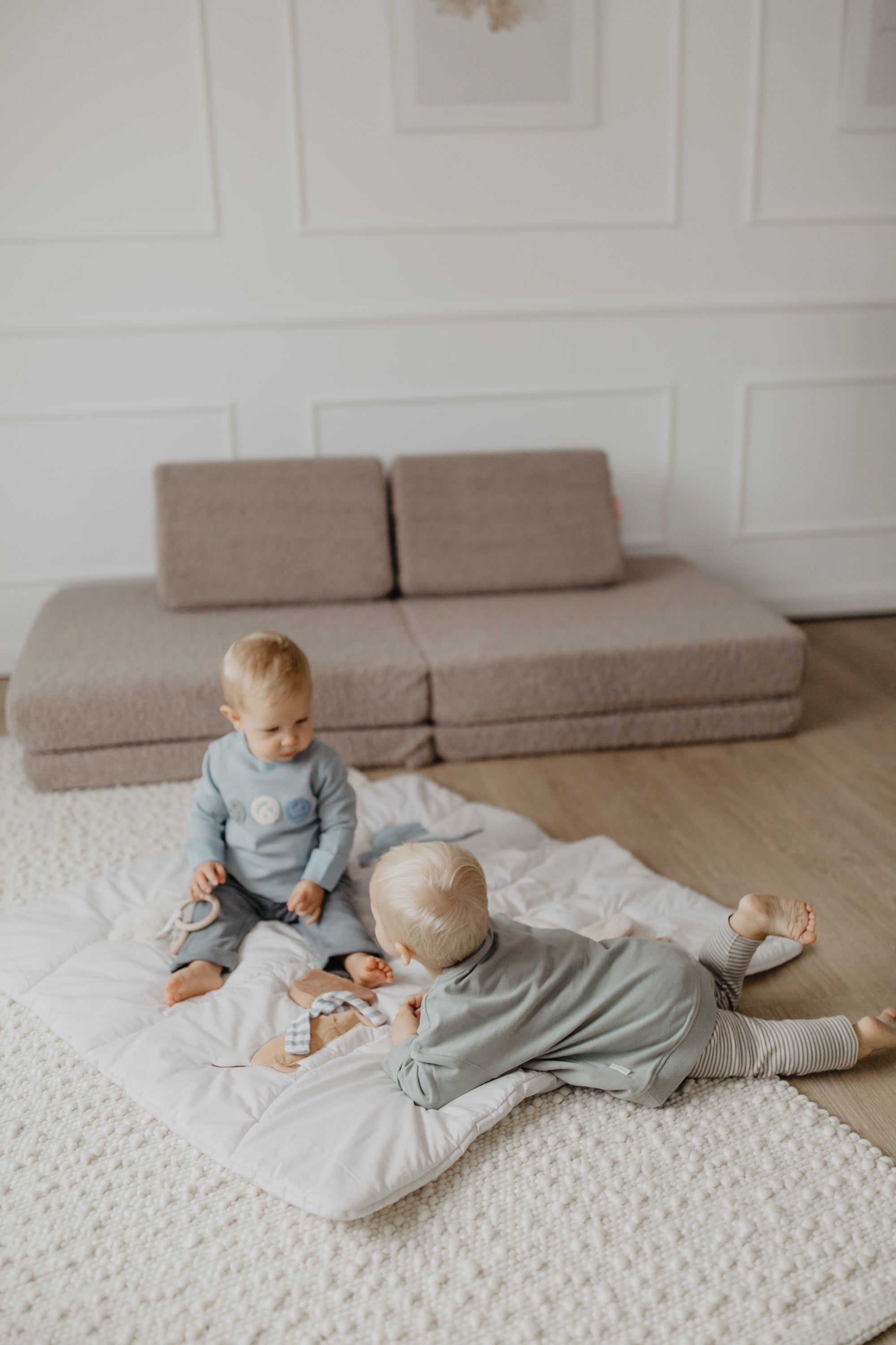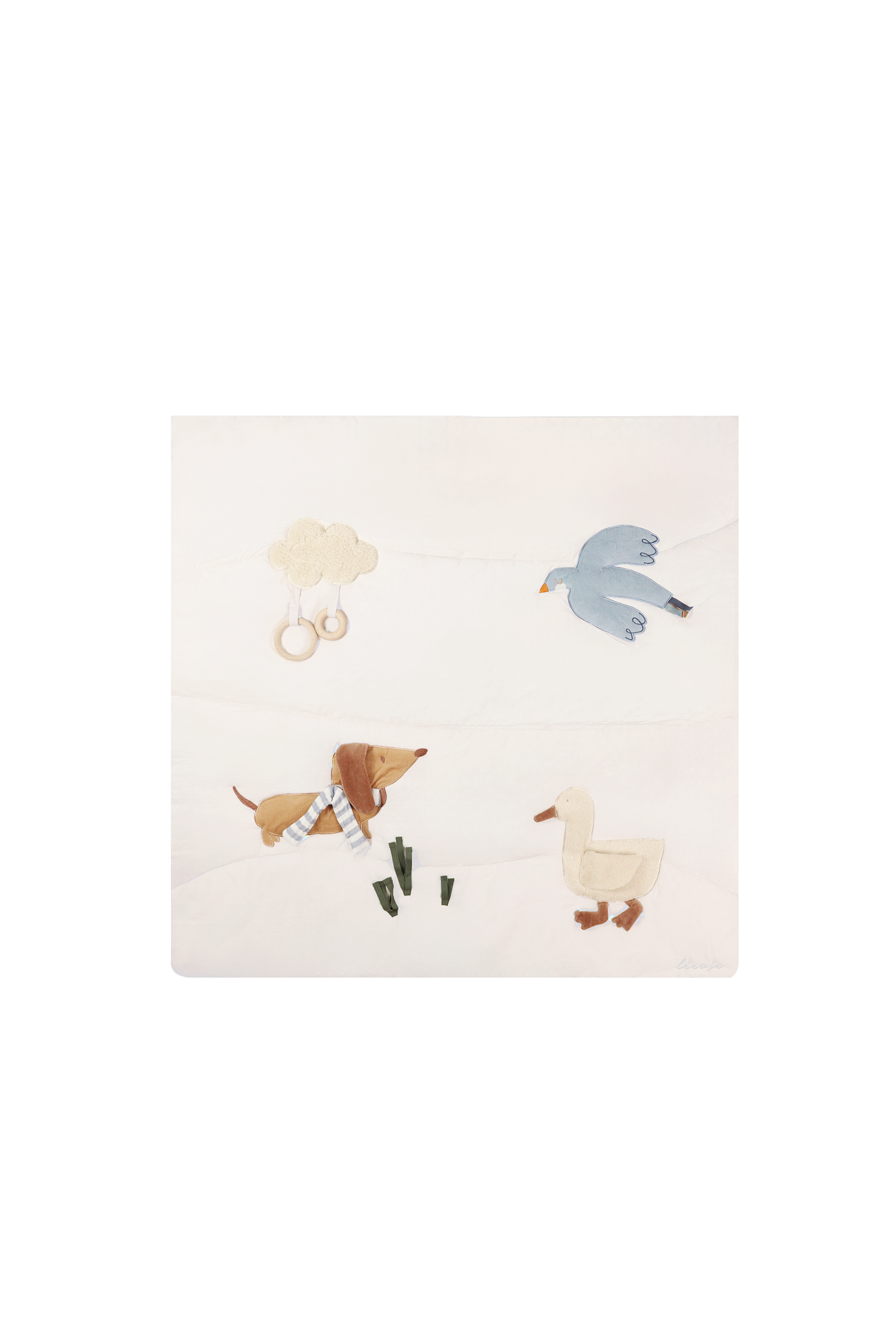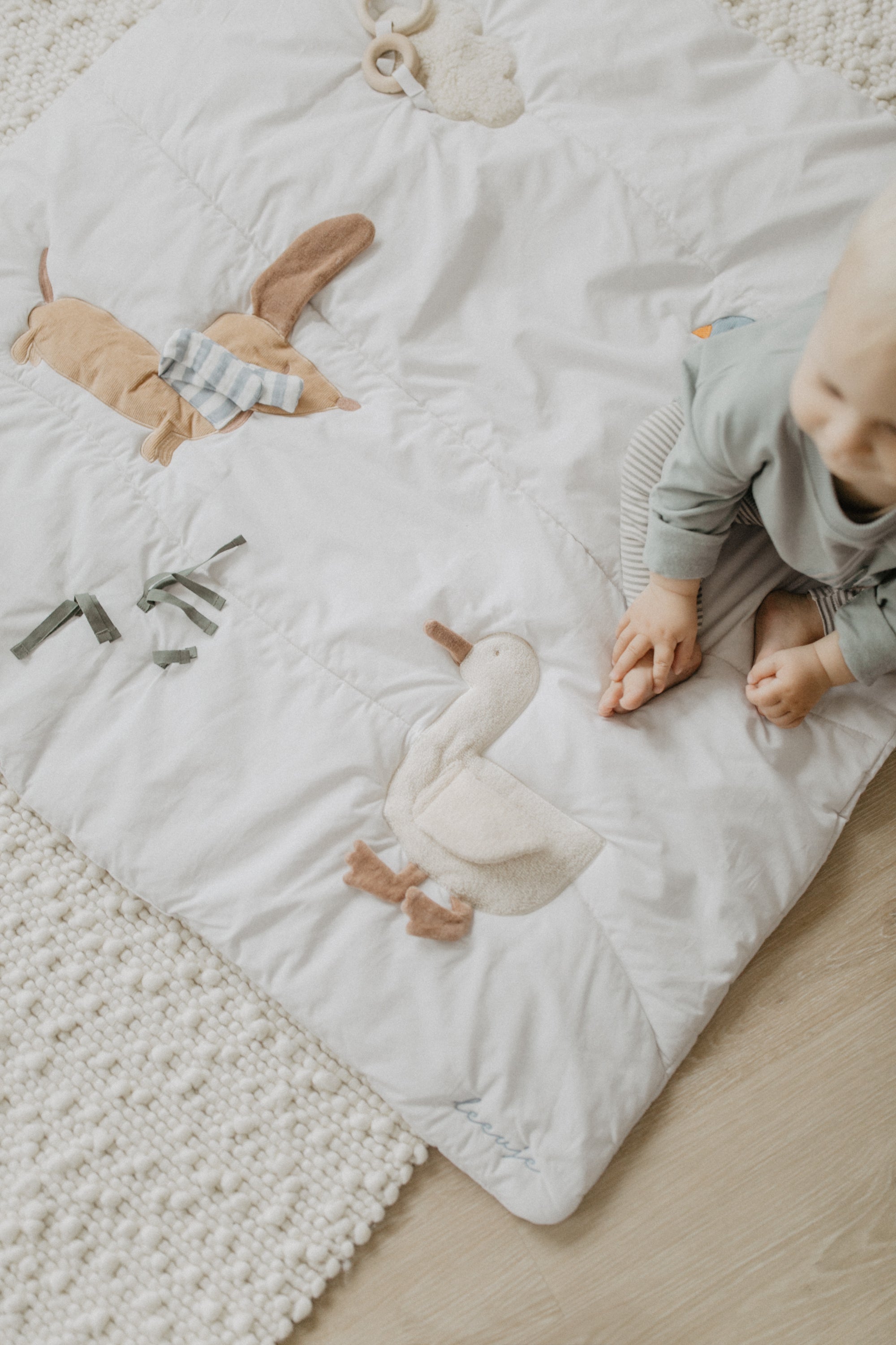 Gepolsterte Activity-Decke als süßer Spielplatz aus verschiedenen Stoffen, mit Rassel, Quietscher und knisternden Elementen