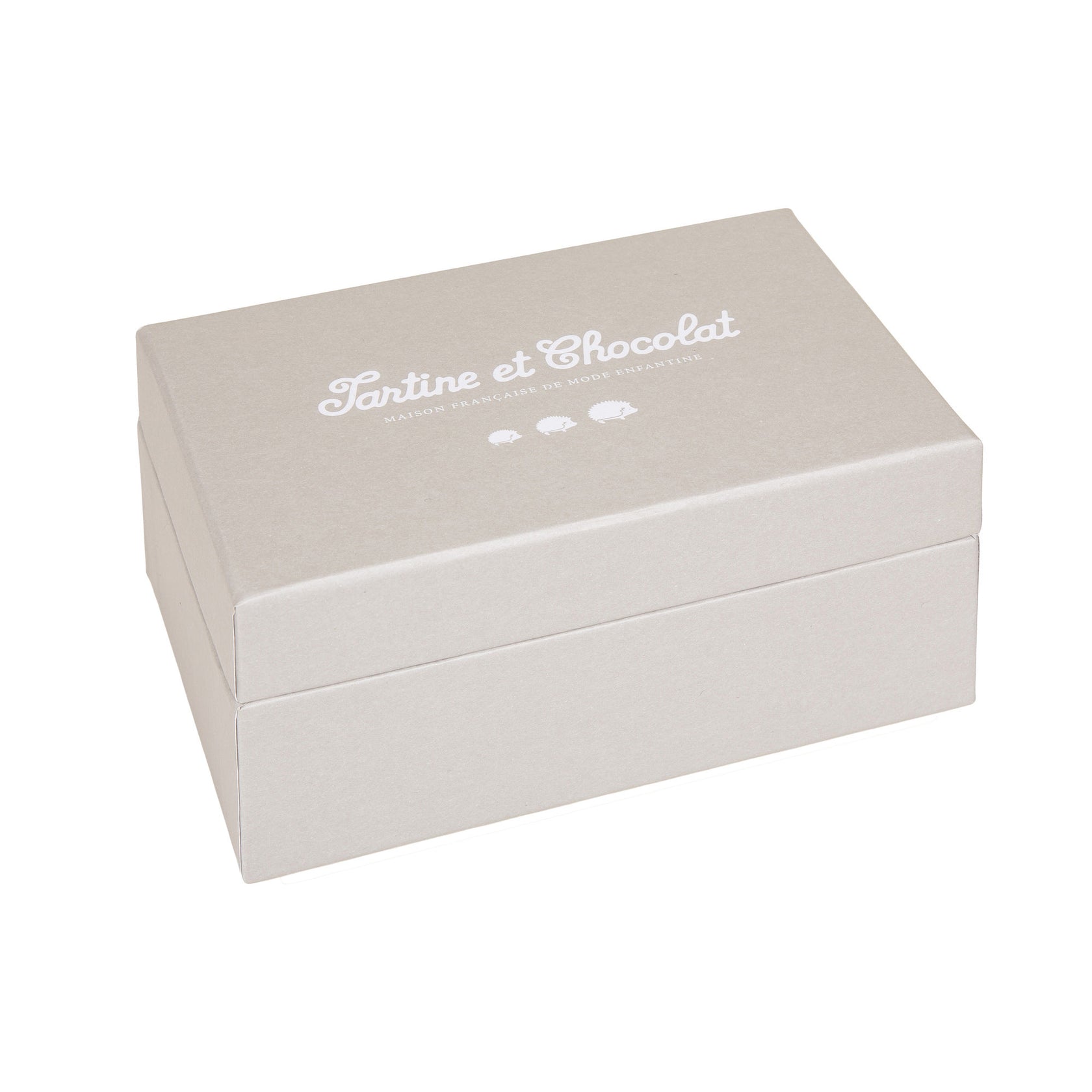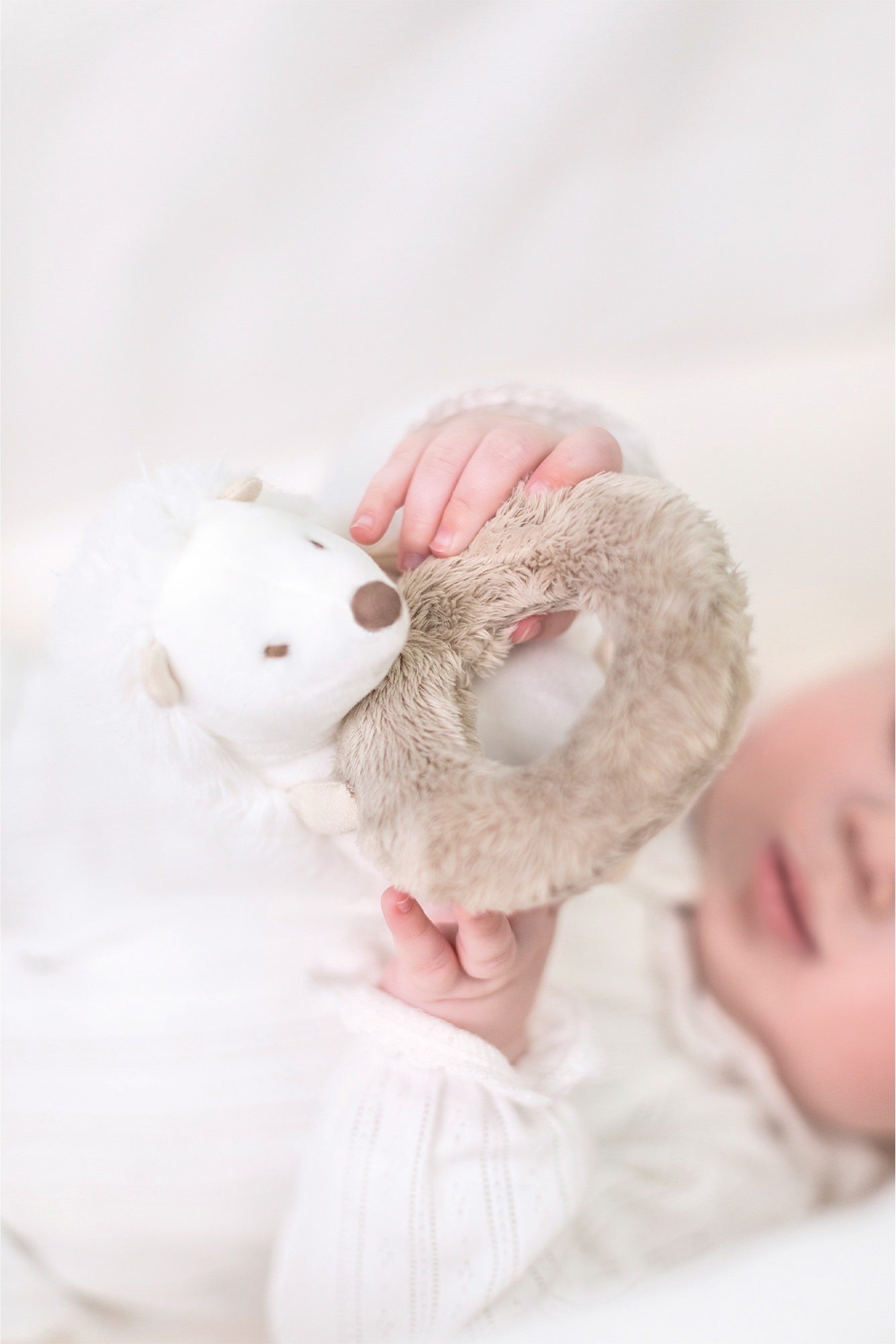Kleiner weißer Igel, hält einen weichen Ring aus Plüsch in den Pfoten, zarte Rassel ist im Ring zu hören, wird in einer Schachtel geliefert